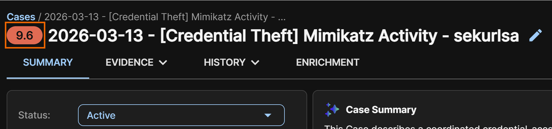 Currently, the case risk score equals the highest threat score of all detections added to the case. Later, the risk score will incorporate multiple risk factors for more accurate and nuanced scoring.