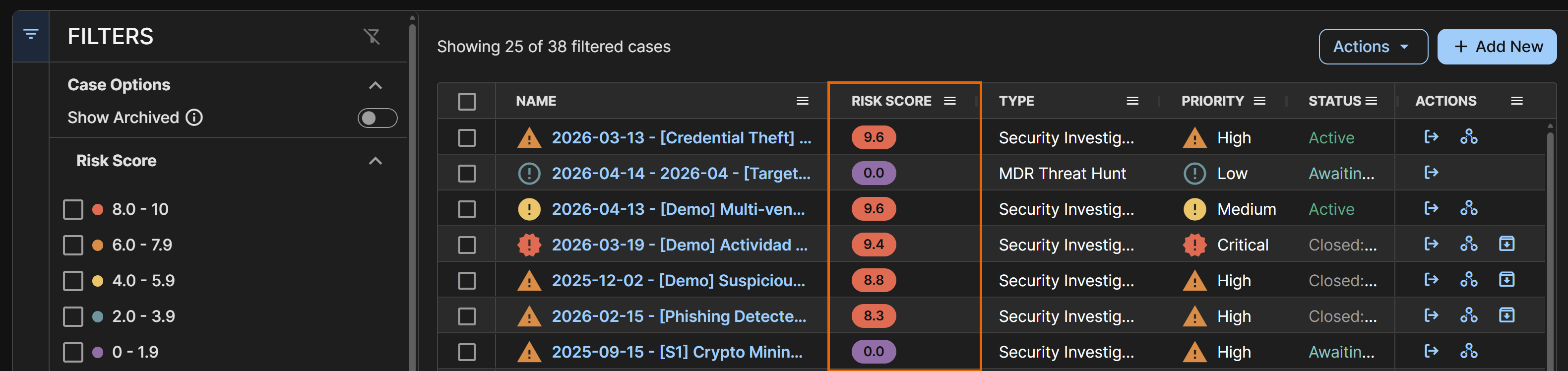 For users opted in to Preview mode, the risk score shows in the table on the Cases page and next to the case name on case details pages.