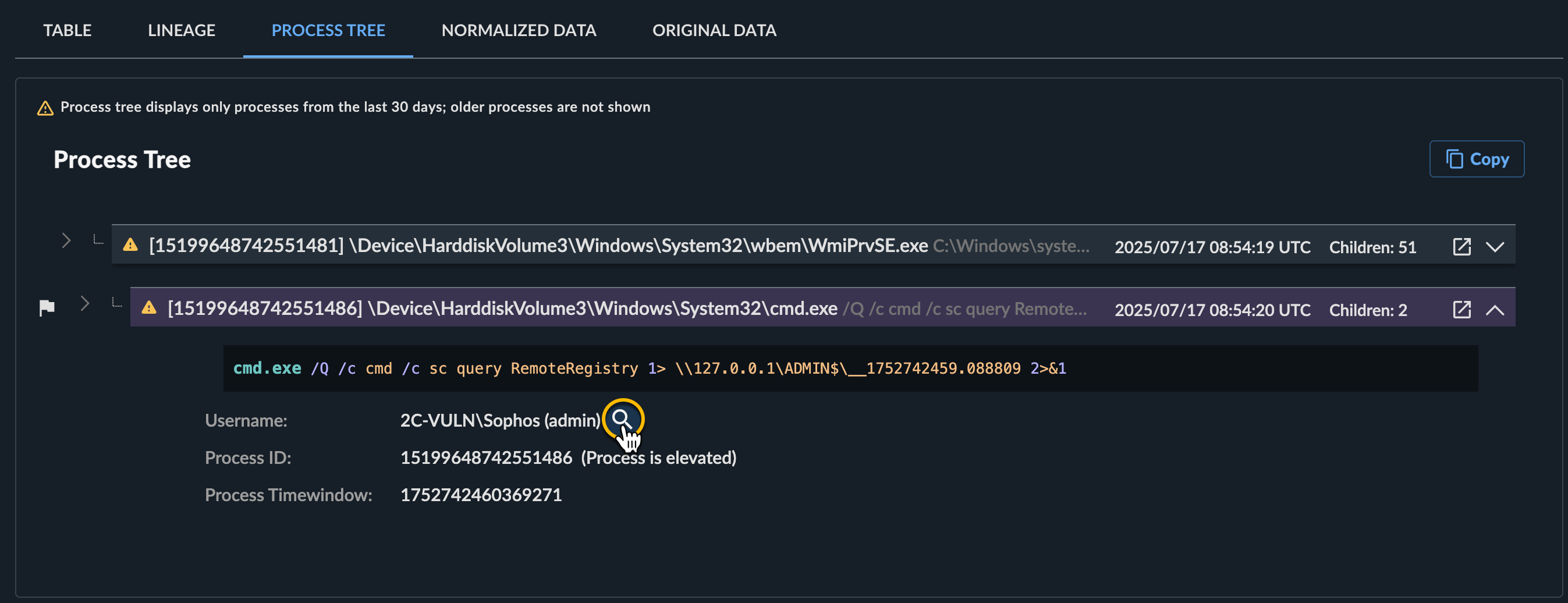 Process trees display only processes from the last 30 days; older processes are not shown. If the source process event itself is more than 30 days old, the Process Tree tab is disabled.