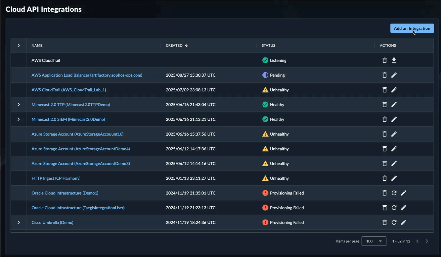 - From the Taegis Menu, select Integrations → Cloud APIs.