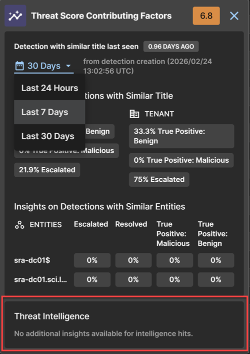 VirusTotalやAPIVoidから脅威インテリジェンスヒットがあるエンティティは、脅威スコアの算出に考慮され、脅威スコア寄与要因パネルおよび検出インサイトタブに表示されます。この情報を活用して調査の優先順位を決定してください。TIヒットが確認された高い脅威スコアは、特に複数のソースで裏付けられている場合、より高い緊急性が求められます。