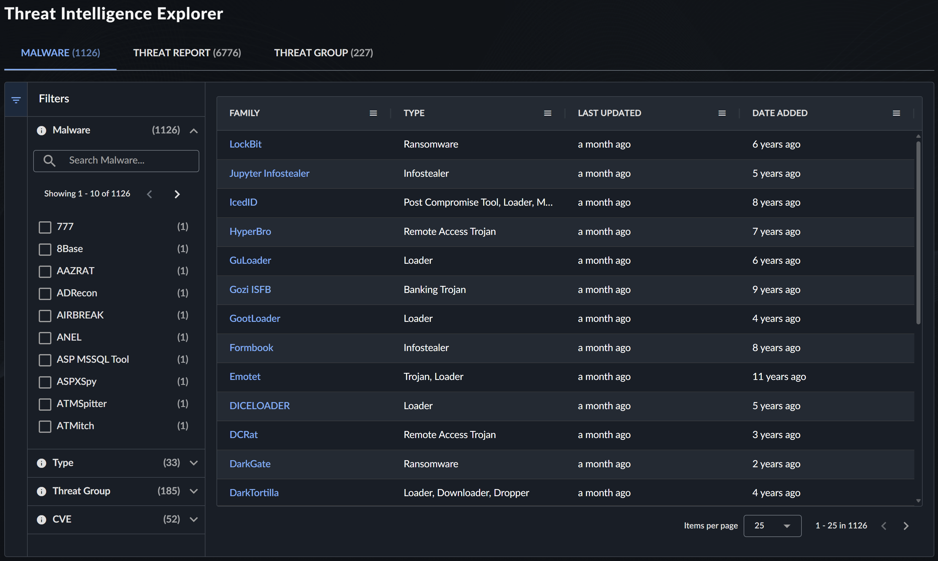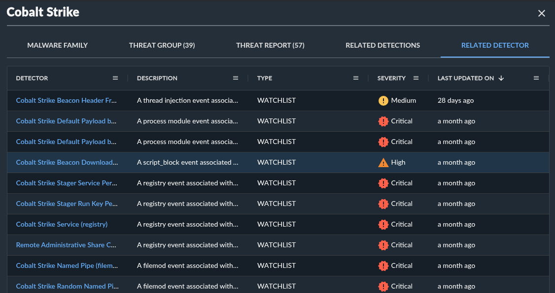 デフォルトでは、テーブルはCTUが設定した脅威優先度(お客様にとって重要または現在の脅威となるマルウェアファミリー)でまずソートされ、次に最終更新日時でソートされます。