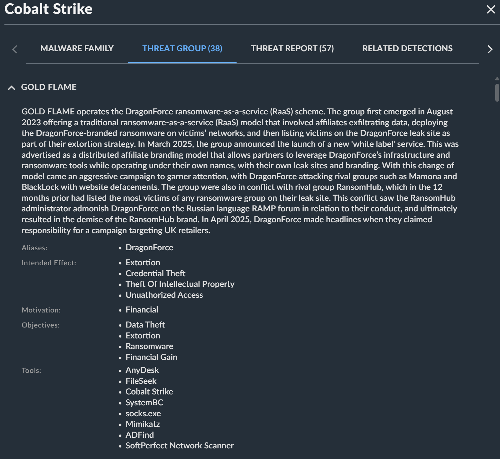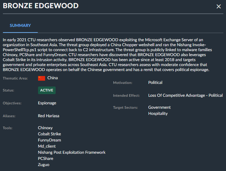 脅威グループを選択すると、グループに関する以下の詳細なインテリジェンスが表示されます。