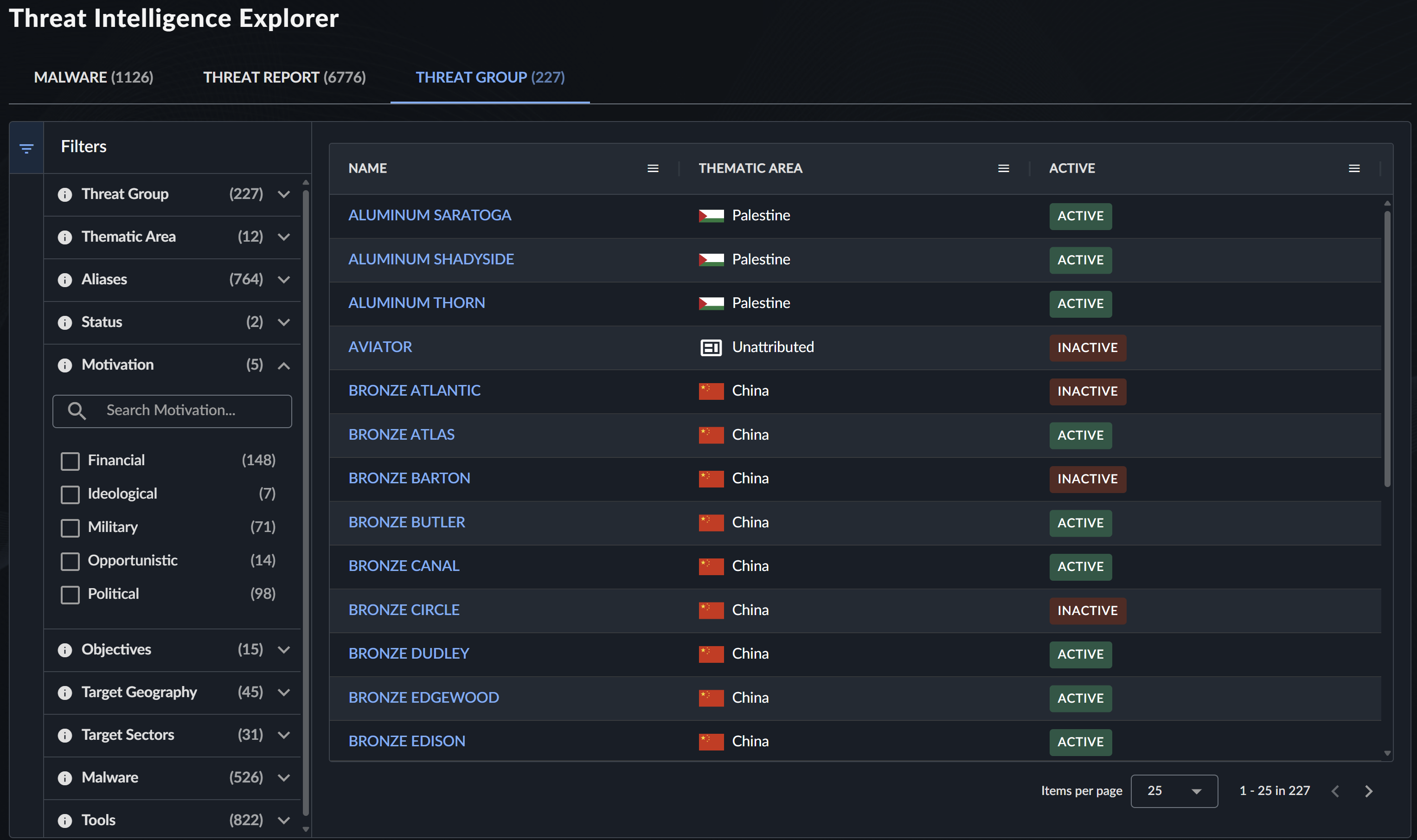 以下のフィルターを使用して、脅威グループデータを調査できます。