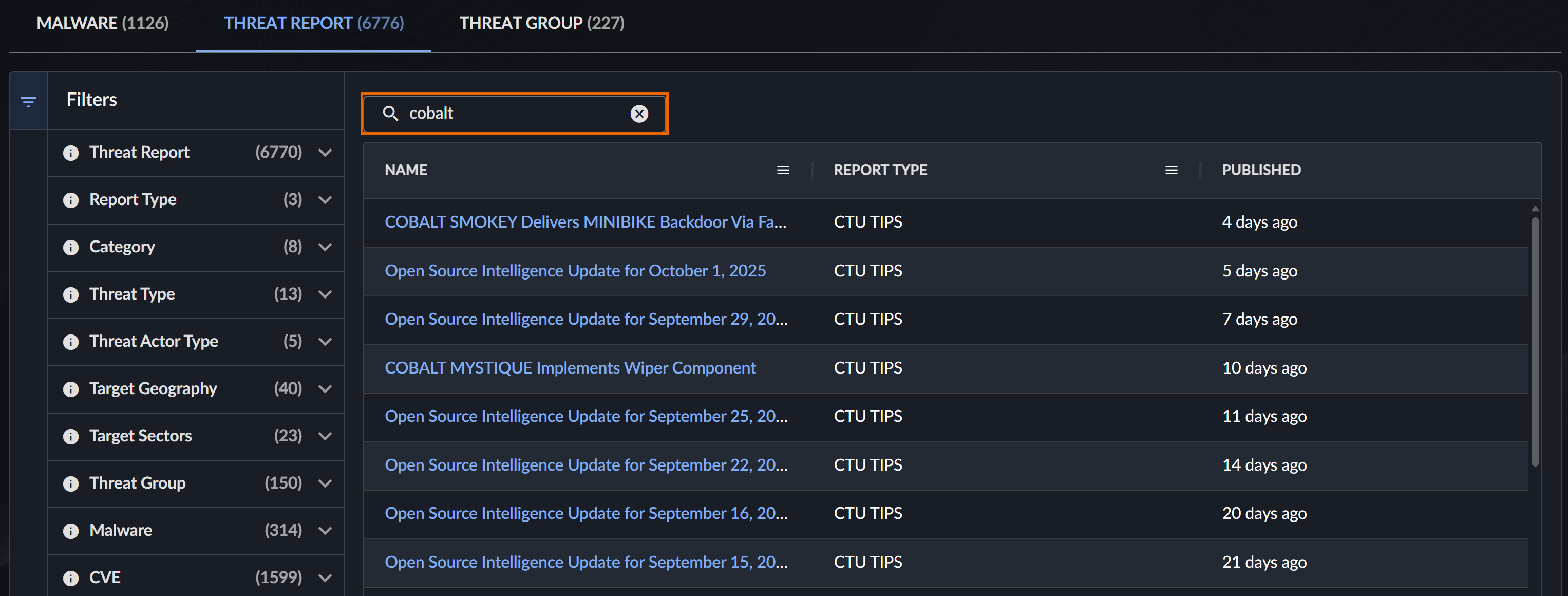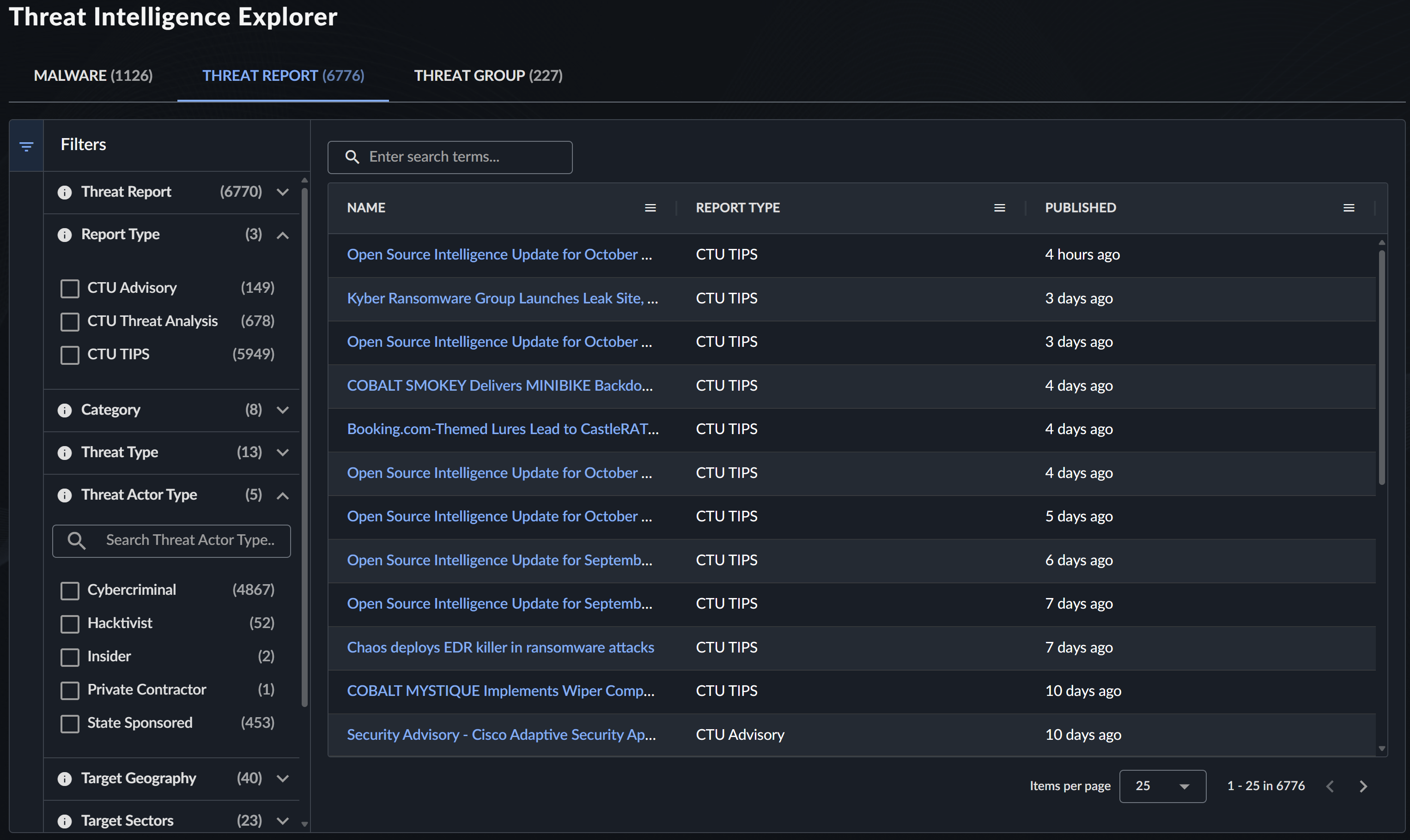 脅威レポートタブでは、CTUの脅威インテリジェンスレポート(デイリーブリーフィング、詳細分析、脅威アドバイザリなど)をすべて閲覧できます。詳細は脅威インテリジェンスレポートをご覧ください。